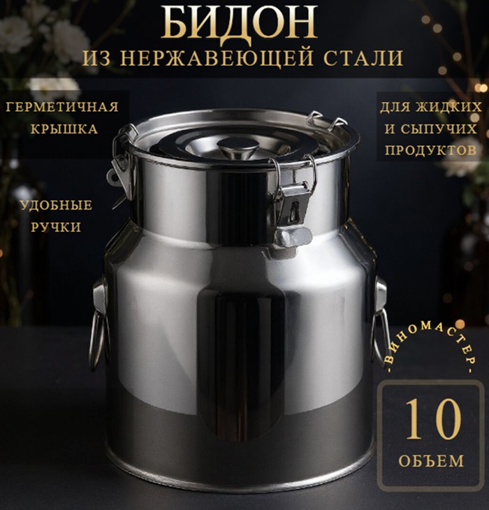 Бидон из нержавейки объемом 10 л "Виномастер" предназначен для длительного хранения пищевых жидкостей (воды, масел, соков, алкогольных напитков) и сыпучих продуктов (круп, орехов, семечек, сухофруктов). Может использоваться в качестве емкости для брожения.