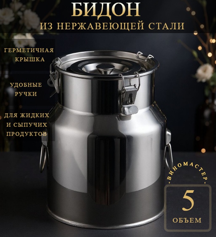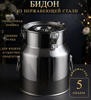 Бидон из нержавейки объемом 5 л "Виномастер" предназначен для длительного хранения пищевых жидкостей (воды, масел, соков, алкогольных напитков) и сыпучих продуктов (круп, орехов, семечек, сухофруктов). Может использоваться в качестве емкости для брожения.