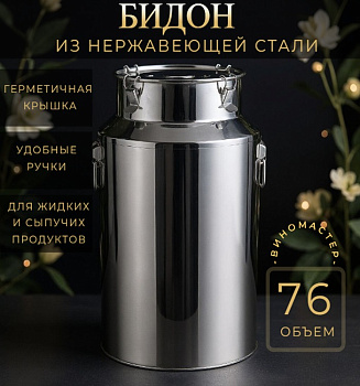 Бидон из нержавейки объемом 76 л "Виномастер" предназначен для длительного хранения пищевых жидкостей (воды, масел, соков, алкогольных напитков) и сыпучих продуктов (круп, орехов, семечек, сухофруктов). Может использоваться в качестве емкости для брожения.