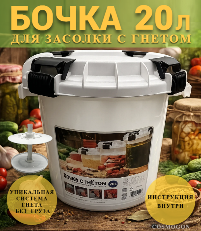 Пластиковая бочка для засолки и консервации продуктов, оснащенная встроенным гнетом, идеально подходит для заготовки овощей, фруктов, мяса, рыбы. Она не требует использования тяжелого груза, так как пресс уже находится внутри бочки.