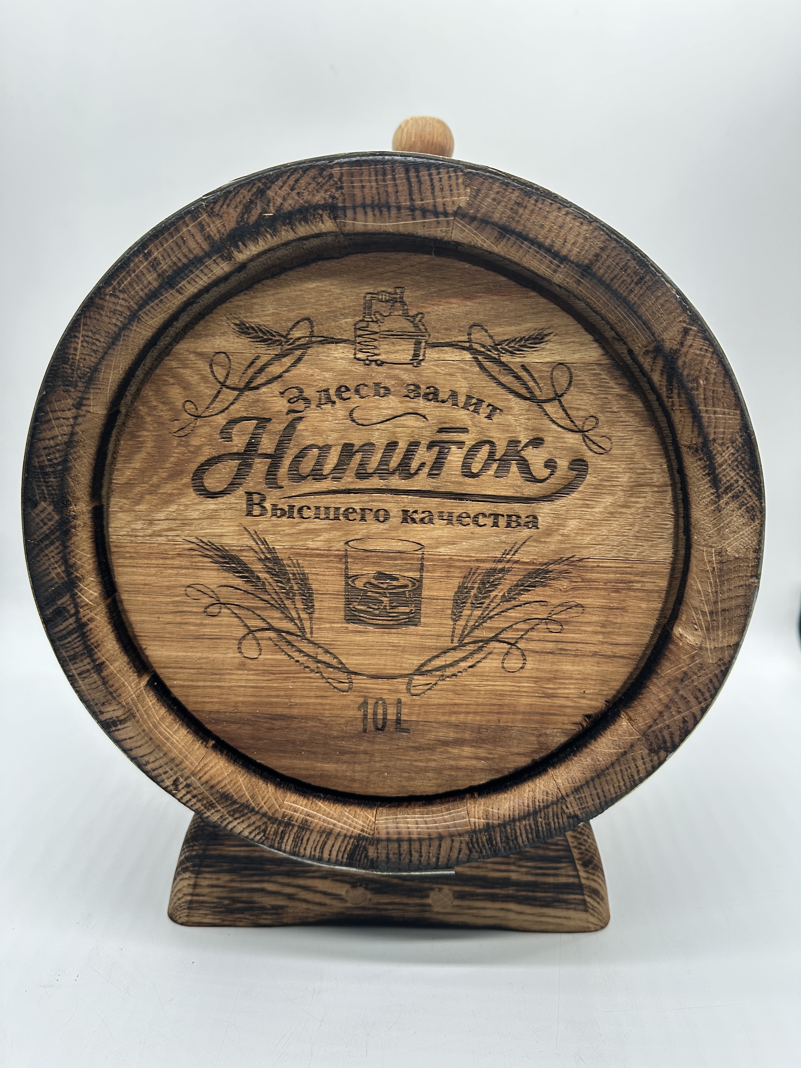 Дубовая бочка подарочная «НАПИТОК ВЫСШЕГО КАЧЕСТВА» внешний обжиг 10 л (кавказский дуб):