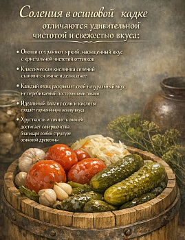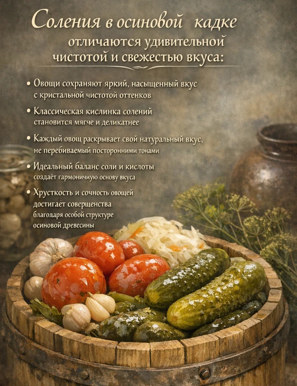 - Приготовленные в осиновой кадке продукты не содержат консервантов, стабилизаторов, красителей, усилителей вкуса и других пищевых добавок, они богаты витаминами и минералами. Себестоимость домашних солений в разы дешевле магазинного товара.